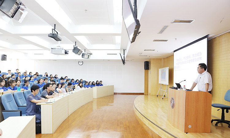 9月2日,厦门国家会计学院2019学年新学期正式开启。为帮助研究生新生更好地适应学院的学习生活,在新起点上迈好第一步,学院党委书记刘光忠以“不忘初心,牢记使命,努力成为中国特色社会主义合格建设者和接班人”为主题,为2019级新生开讲研究生生涯的第一堂思想政治理论课。“第一课”由学院党委委员、院长助理黄京菁主持,研究生处全体教职工与100名新生共同聆听了党课。
