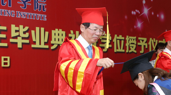 接下来,黄世忠院长以师长的身份与同学们分享了他教书育人三十年的心得体会。他说,同学们毕业后走进社会,要化压力为动力,努力培养一种脚踏实地、埋头做事的心性,坚持锤炼一份耐得寂寞、乐得辛苦的精神,以良好的心态和坚强的毅力,把握数据时代赋予的大好机遇,提升自己,迎接挑战,贡献社会,从而成就一番作为。他说,在数据星球时代,你们这批90后的原住民,比我们这些60后的新移民要幸运得多,也必将比我们更有大作为。因为你们年纪轻轻就有了明确的人生目标,并为之奋斗,尤其是你们当中有很多人当时是跨学科考到会计专业来的。我们的时代需要这种目标明确、跨界创新、跨界竞争、跨界颠覆的精神,这也恰恰是事业成功的关键元素;因为你们同时遇上会计学科由冷转热时期和信息爆炸的大好时期。一方面,会计信息不可或缺,会计人才举足轻重;另一方面,商业模式日新月异,技术创新突飞猛进,大众创新万众创业风起云蒸,大数据等信息科技将赋予你们无穷的力量。你们生而逢时,更当善于抓住时代赋予的机遇,博观约取,厚积薄发,勇于作为。最后,黄世忠以中国古典哲学经典表述“天道酬勤,地道酬善,商道酬信,业道酬精”与同学们共勉,并祝大家事业有成,家庭幸福!