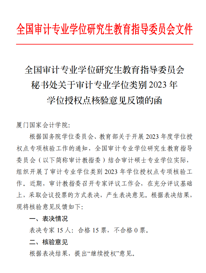 近日,国务院学位委员会办公室和全国审计专业学位研究生教育指导委员会完成了审计专业学位类别2023年学位授权点专项核验工作。学院审计专业学位点以专家组全票通过的优异成绩,顺利通过审计专业学位授权点专项核验。