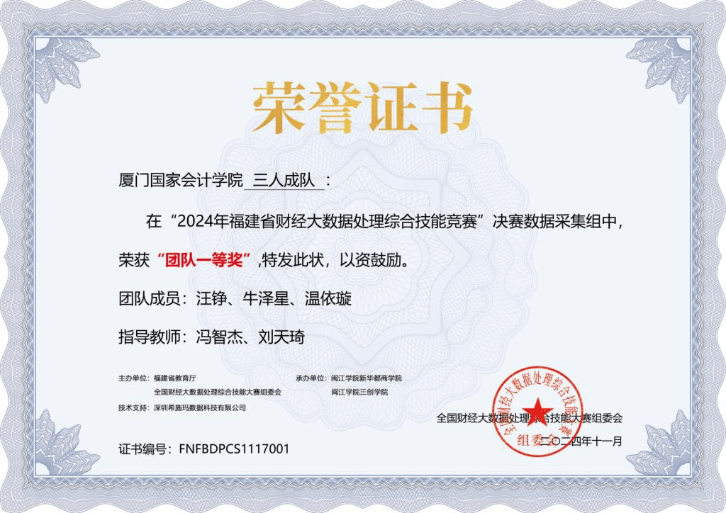 11月17日,2024年福建省财经大数据处理综合技能竞赛在闽江学院举行,本次大赛由福建省教育厅主办,闽江学院新华都商学院、三创学院承办,深圳希施玛数据科技有限公司提供技术支持。大赛汇聚了来自厦门大学、福州大学等多所省内知名高校的学生精英,赛事规格高、竞争异常激烈。在学院领导和研究生处的大力支持下,历经初赛和决赛多轮角逐,2024级研究生牛泽星、汪铮、温依璇组成的“三人成队”团队在全省28所院校、1048名参赛选手中脱颖而出,荣获“数据采集组”一等奖,冯智杰、刘天琦获得优秀指导教师奖。