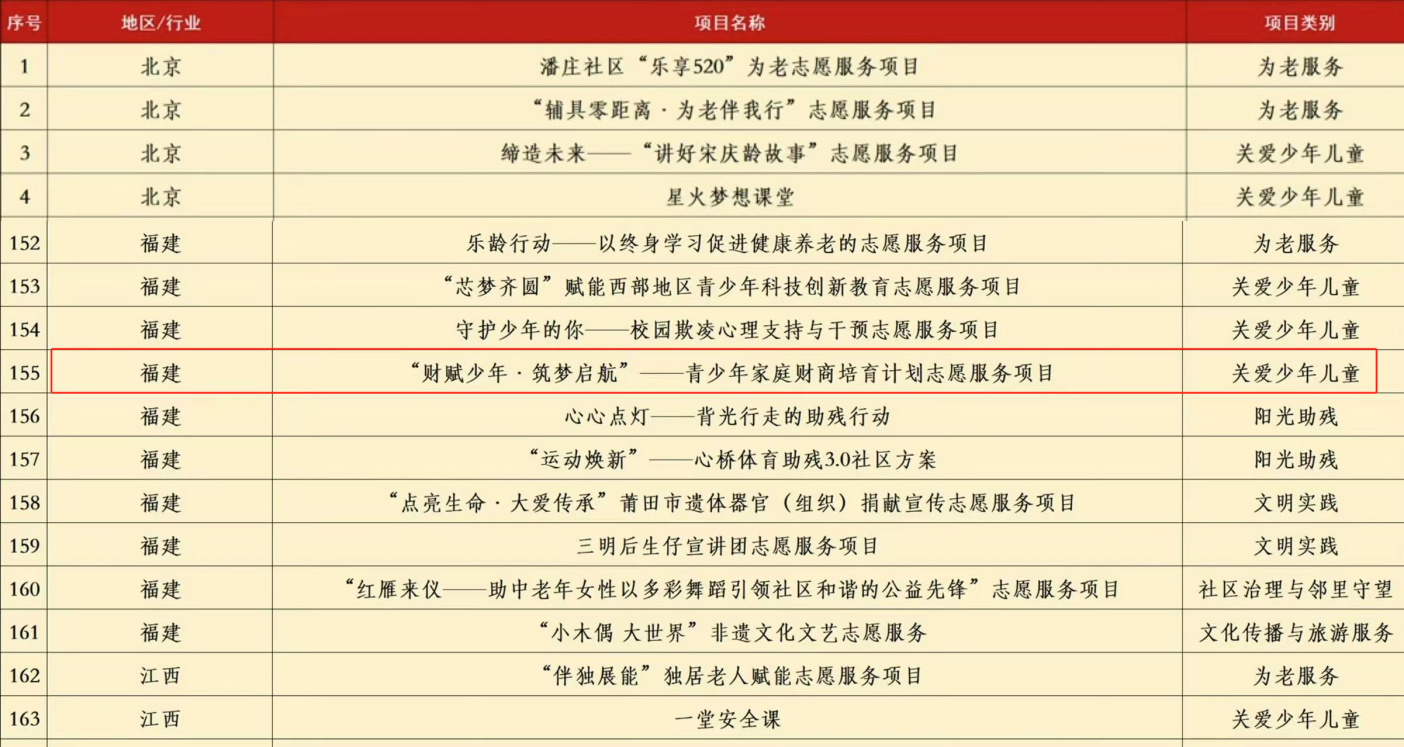 近日,由共青团中央、中央社会工作部、民政部、水利部、文化和旅游部、国家卫生健康委、中国残联、中共广东省委、广东省人民政府共同主办的第七届中国青年志愿服务项目大赛暨志愿服务交流会落下帷幕。经省级推报、全国初评、决赛终评等环节,由学院团委组织申报的“‘财赋少年·筑梦启航’青少年家庭财商培育计划志愿服务项目”斩获第七届中国青年志愿服务项目大赛国赛铜奖,这一荣誉不仅是对学院志愿服务工作的肯定,更是对全体志愿者辛勤付出的最好回报。