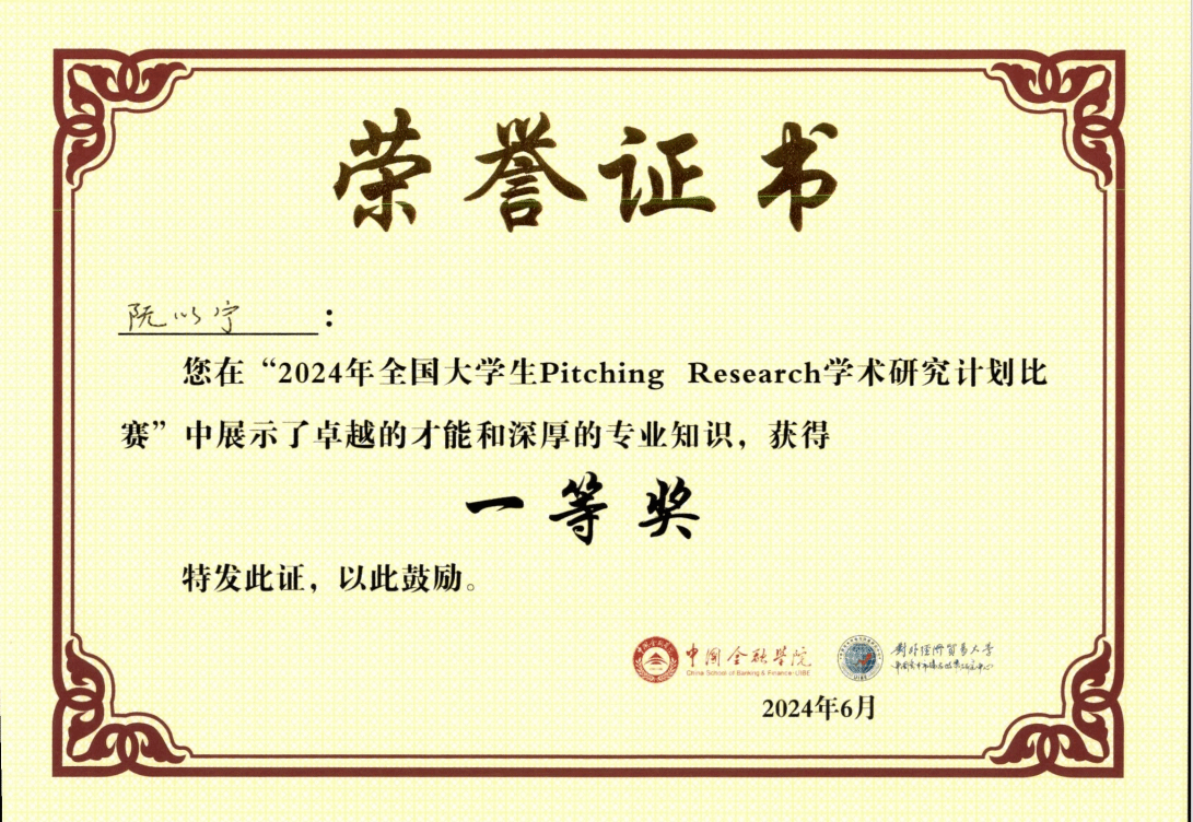 近日,在2024年全国大学生Pitching Research学术研究计划比赛中,我院阮以宁同学在陈丽芳老师与何如桢老师的指导下,荣获大赛一等奖。