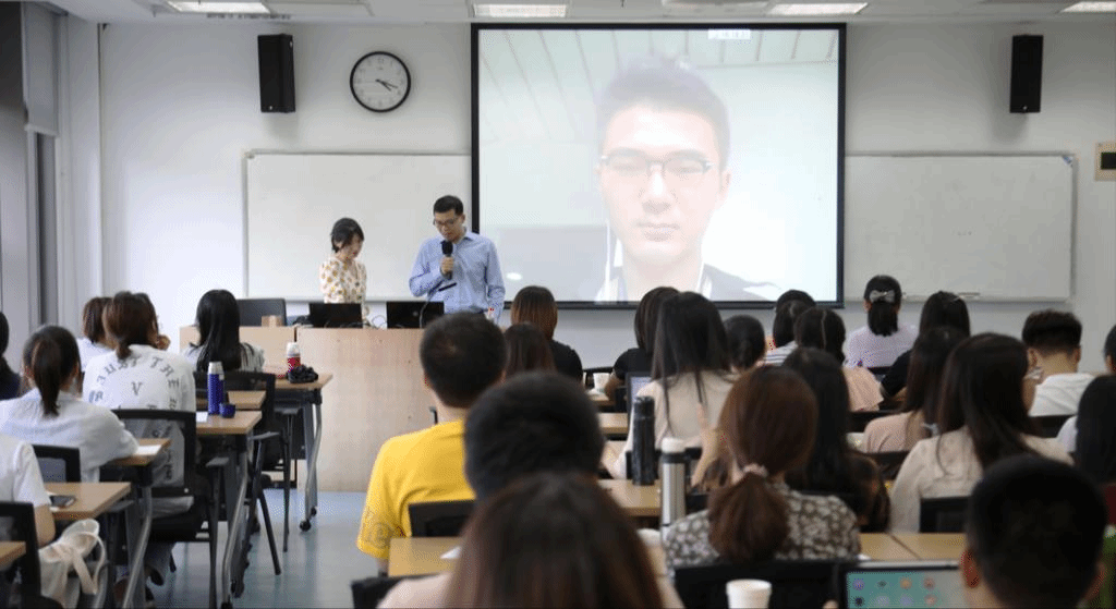 讲座开始,王教授远程连线目前参加我院与新加坡管理大学联合培养项目的2018级研究生许文涛。许文涛同学在视频中表达了对祖国和母校深切的思念。接着,他详细地为学弟学妹们介绍备考雅思的经验、在国外的学习生活以及个人的所感所想。他认为,新加坡管理大学是一所可以满足学子期望的现代化大学,它不仅具备国际领先的研究能力,同时为所有学生准备了覆盖面较广的奖学金,此外,学校的就业指导老师将给予学生全面的简历指导和面试指导。学长生动且贴近生活的留学经验分享,引发了同学们浓厚的兴趣。最后,许文涛同学鼓励学弟学妹们勇敢地追寻梦想,祝福学弟学妹们学有所成。