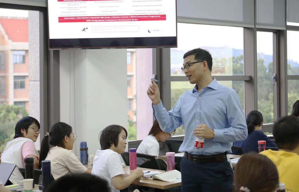 随后,王教授以数据能力框架为切入点向同学们简要介绍了现代财会人员为适应发展应该具备的数据能力。对于基础的财会人员,掌握fundamental statistics、ETL skills、Data analytics with Excel等是必须的;中级财务人员应熟练使用Data management and governance including SQL、Programming(R or Python)for basic regression and classification、Information systems and RPA等。最后,王教授向大家介绍了新加坡管理大学与我院联合培养的硕士项目MPA(会计硕士项目)和MSA(财务大数据分析硕士项目),并对两者的异同做了简要的说明。