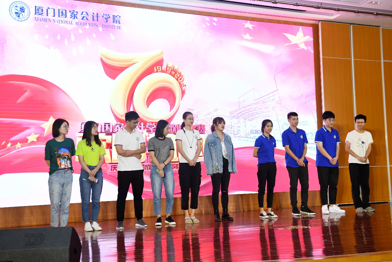 最后,比赛结果隆重宣布。2019级会计班同学的节目《我和我的祖国》荣获一等奖;孟亚奇同学的节目《我爱你,中国》,肖梦涵、代艳等同学的节目《红旗飘飘》分别荣获二等奖;桑颖同学的节目《赤伶》,2019级审计班同学的节目《我爱你中国》,孟亚奇、王凯同学的节目《东方之珠》分别荣获三等奖;张鹏程同学的节目《大中国》,2019级税务班同学的节目《歌唱祖国》,赛宗盛同学的节目《同一首歌》,刘剑同学的节目《今天是你的生日,我的祖国》,孔令森同学的节目《国家》分别荣获优秀奖。