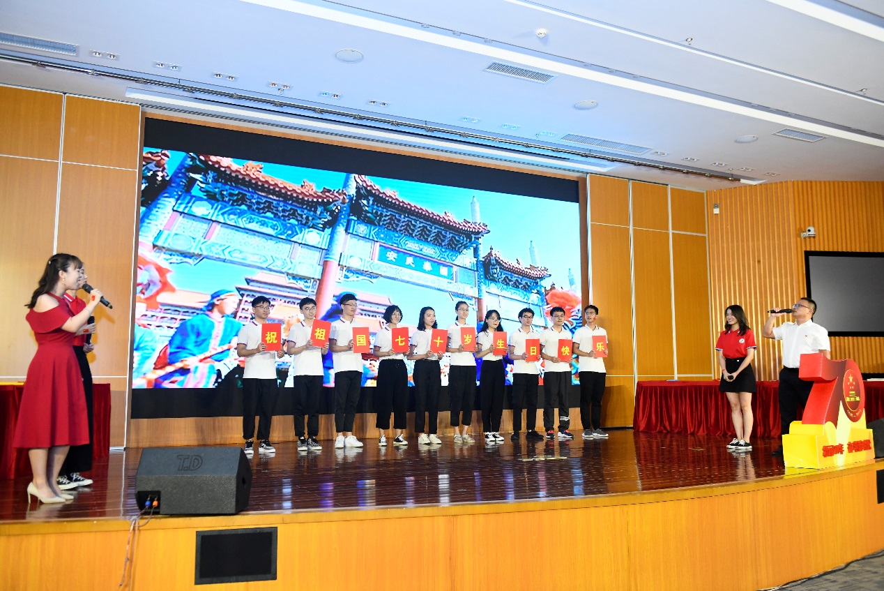 2019级税务班的同学们和2019级税务班班主任张冯老师带来合唱《歌唱祖国》,党办院办的钟德清老师倾情助力、深情朗诵。在满怀热情的歌声中,祖国诞生的七十年历程犹如壮丽画卷一般浓墨重彩地在观众脑海中慢慢铺开。合唱最后,同学们举起了展牌,共祝祖国生日快乐。