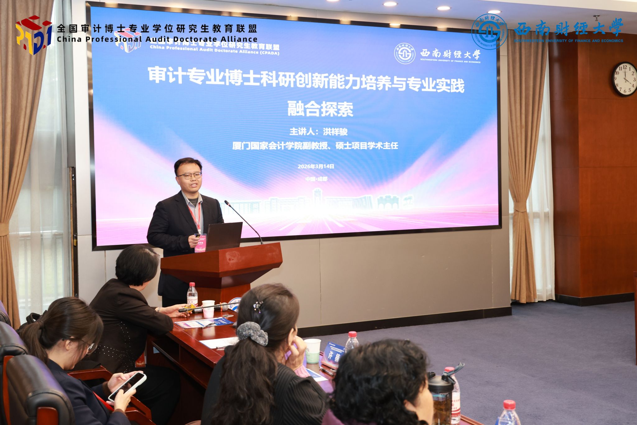 洪祥骏以“审计专业博士科研创新能力培养与专业实践融合探索”为题进行分享。他从专业课程授课教师的视角,介绍了在审计专业博士科研创新能力培养方面的思路设计与实践融合路径,重点分享了在课程体系、导师团队建设、实践基地搭建等方面的创新做法。